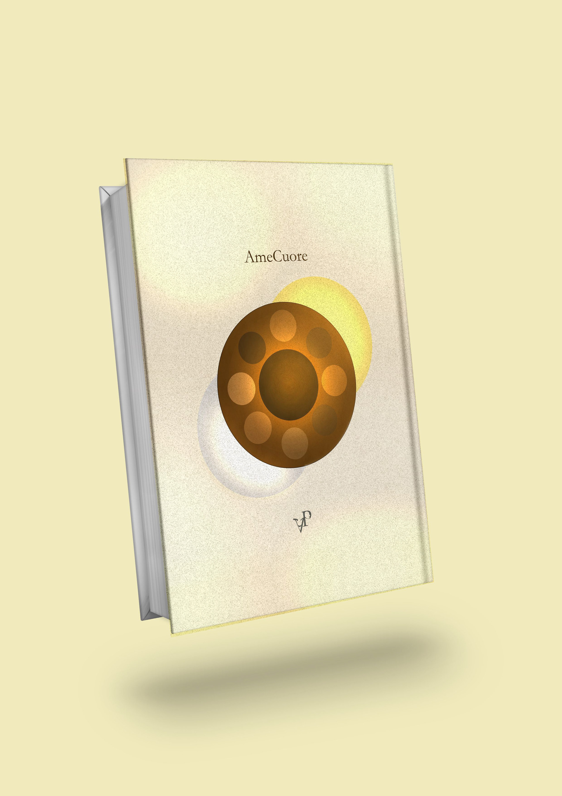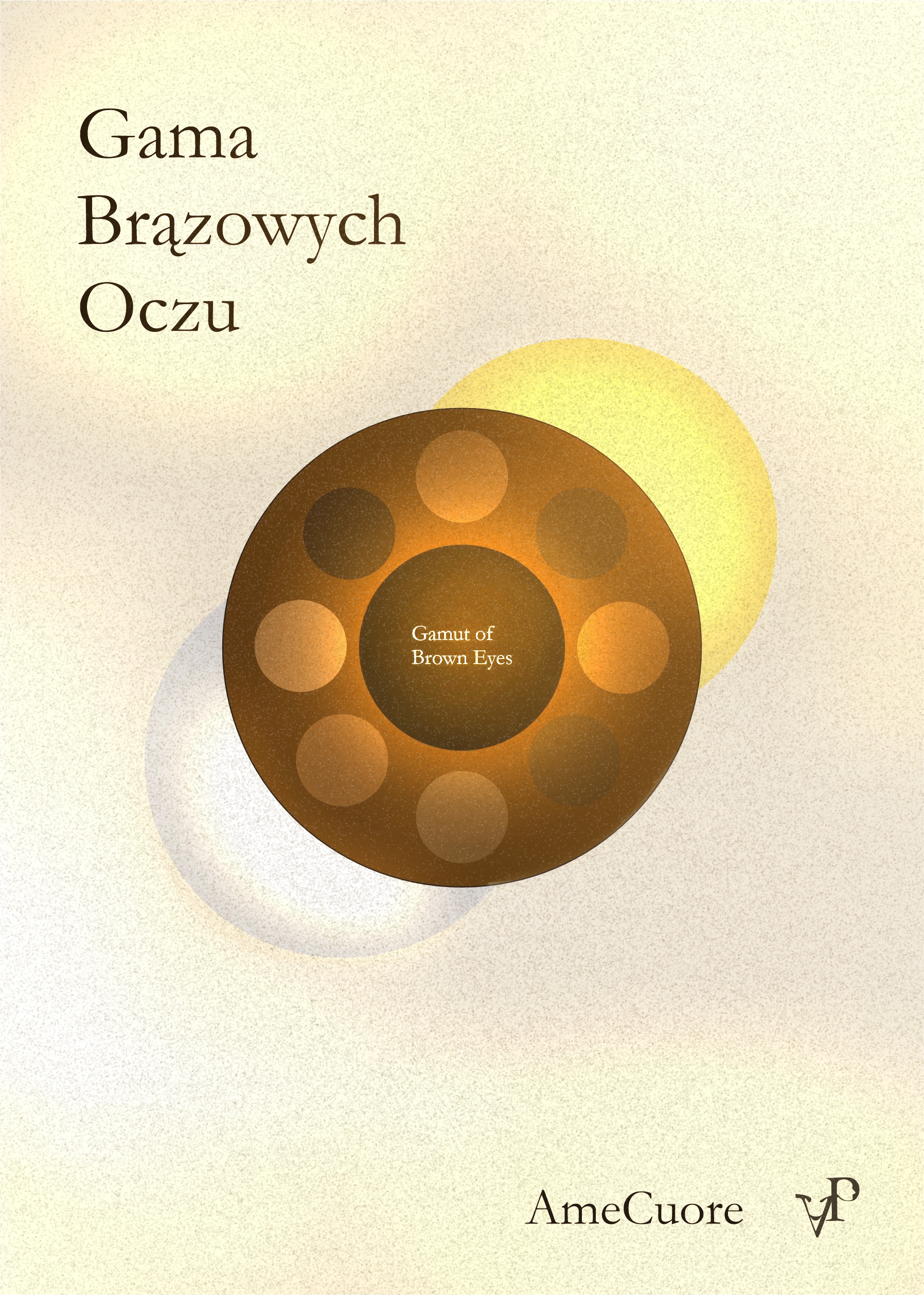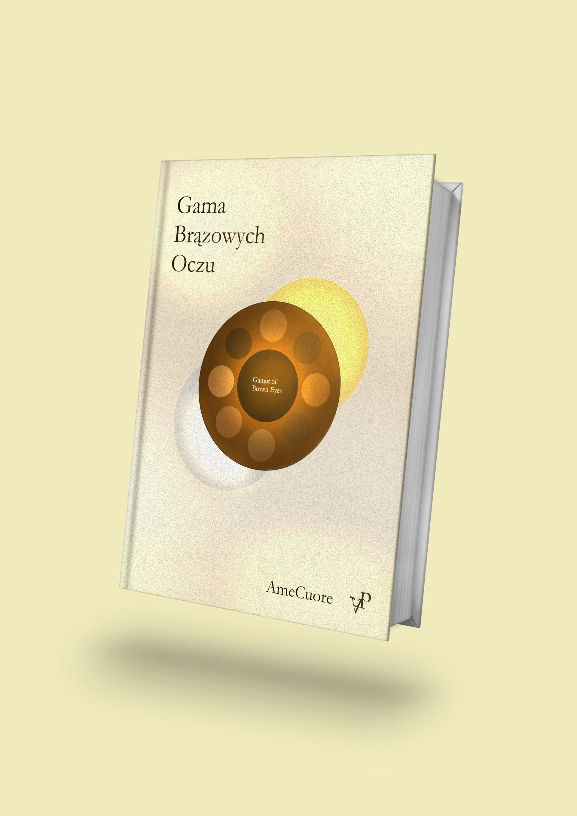 A design created predominantly with warm, lightly saturated shades. During the design process, I wanted to symbolically include a brown iris, the sun and the moon – elements from the author's poetry. I decided to use circles for it.